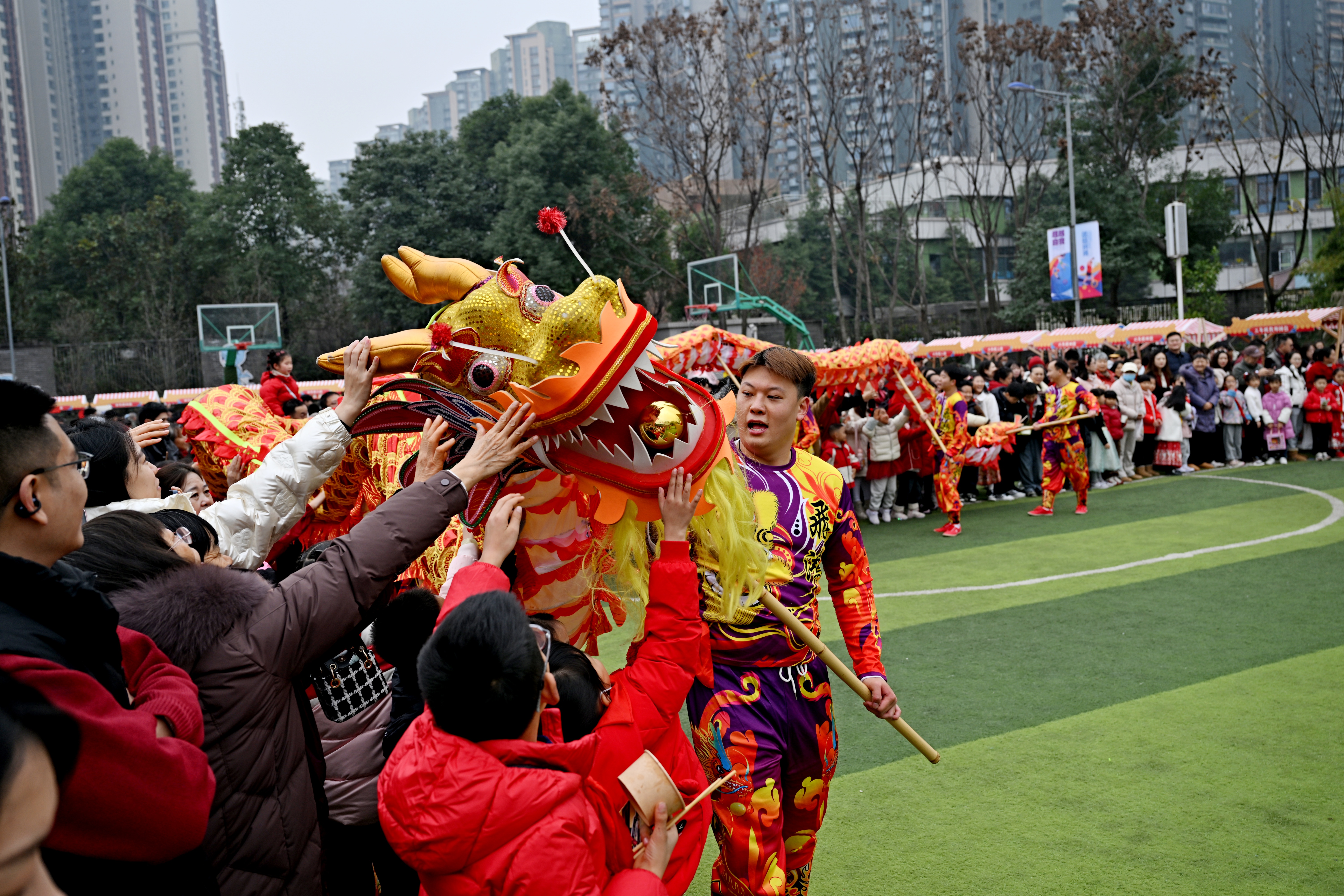 庙会现场,九十余个由学生参与设计和运营的摊位依次排开,涵盖传统手工艺、创意手工、特色小吃等多个类别。糖画、书法、舞龙等民俗项目吸引众多师生和家长参与,校园内洋溢着浓厚的节日气息。